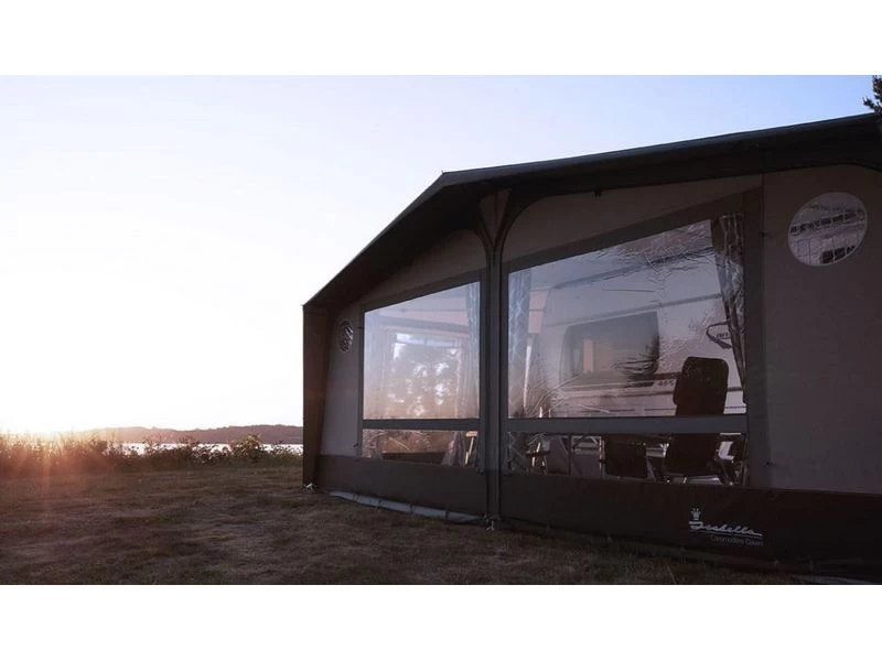 De grote ramen in de front- en zijpanelen zijn rond afgewerkt in de bovenste hoeken en zorgen samen met de hoge ramen achter in de zijwand voor voldoende licht in de gehele voortent. Het ademend Isacryl materiaal is bijzonder kleurvast en zorgt samen met de ingebouwde nokventilatie voor een prettig binnenklimaat. Op warme dagen bieden de insectenhorren in de beide zijwanden voldoende ventilatie.